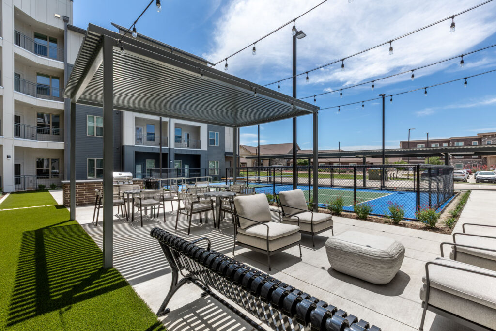 Luxe at Lewisville is a four-story, 148-unit 55+ community offering one- and two-bedroom residences across six thoughtfully designed floor plans. The community features resort-style amenities, including a swimming pool and sun deck, pickleball court, grilling stations, raised garden beds, and a fully programmed clubhouse with a demonstration kitchen, private dining room, game lounge, art studio, coffee lounge, reading room, and private theater. Wellness and lifestyle offerings include a fitness center and yoga studio, massage and treatment room, on-site salon, guest suite, and pet-friendly amenities such as a pet parlor and bark park, all supported by convenient surface parking and carports.